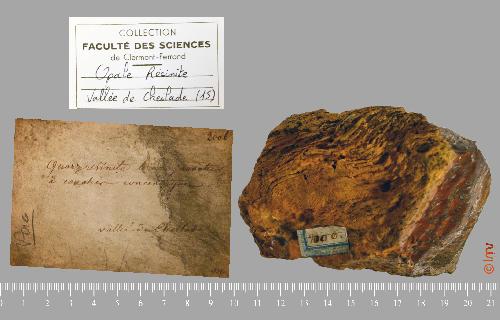 | Commentaire : | Etiquette manuscrite = ''quartz résinite brun jaunâtre à coucher concentrique'' |