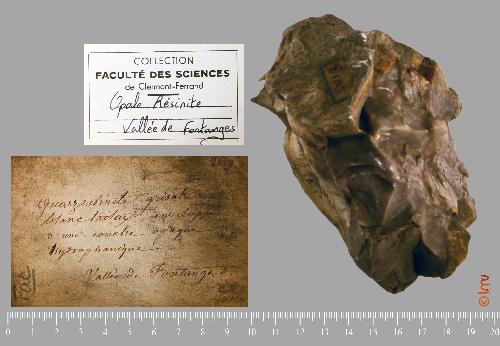 | Commentaire : | Etiquette manuscrite = ''quartz résinite grisatre et blanc laiteux, enveloppé d'une couche opaque hydro…'' |