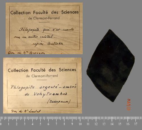 | Commentaire : | 2 étiquettes différentes : Phlogopite argenté-ambré de Vohytramboa (Madagascar) don de M. Lautel et Phlogopite qui s'est moulé s |