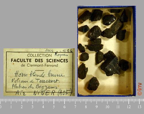| Commentaire : | Ech. C. Pin - Nom sur l'étiquette d'origine = Amphibole (Hornblende ?) en aiguilles creuses sur diorite - C. Pin. Analyses 2019 |
