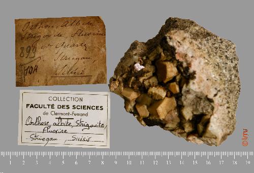 | Nom International : | Orthoclase, albite, strigovite, fluorite |