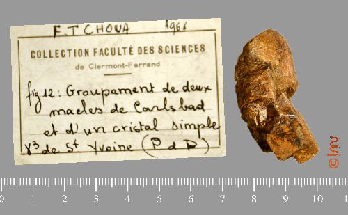 | Commentaire : | Fig 12 : Groupement de deux mâcles de Carlsbad et d'un cristal simple - Filon de granite de St Yvoine |