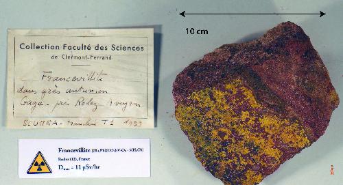 | Chimie : | [(Ba,Pb)(UO2)2V2O8-5(H2O)] |