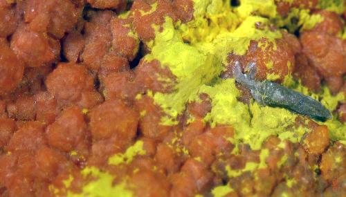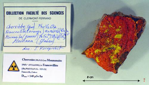 | Commentaire : | Mounanaite : [PbFe+++_2(VO_4)_2(OH)_2] et Francevillite : [(Ba,Pb)(UO_2V_2O_8-5(H_2O)] |