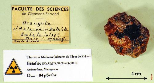 Thorite et Malacon (silicates de Th et de Zr) sur Bétafite