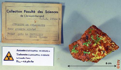 | Commentaire : | C.E.A. 1952-6, Torbernite [Cu(UO_2)_2(PO_4)_2-8-12(H_2O)] |