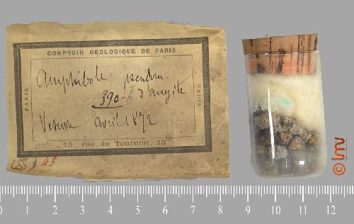 | Chimie : | {Na}{Ca2}{Mg4Fe3+}(Al2Si6O22)F2 |