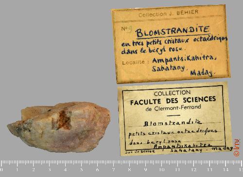| Commentaire : | Don de Béhier - Petits cristaux octoédriques dans béryl rose |