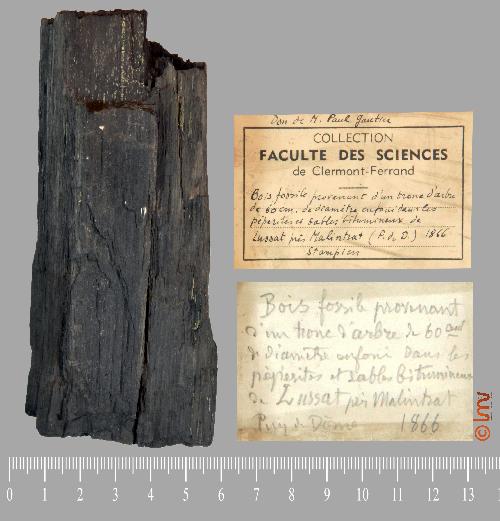 | Commentaire : | privenant d'un tronc d'arbre de 60 cm de diamètre enfoui dans les pépérites et sables bitumeux - Stampien - 1866 - Don de paul G |